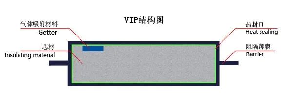 VIP由多孔芯材、吸气剂和阻隔膜三部分复合而成。通过选用低导热芯材和提高板材内的真空度来减少热对流、热传递以及热辐射,从而实现隔热保温。